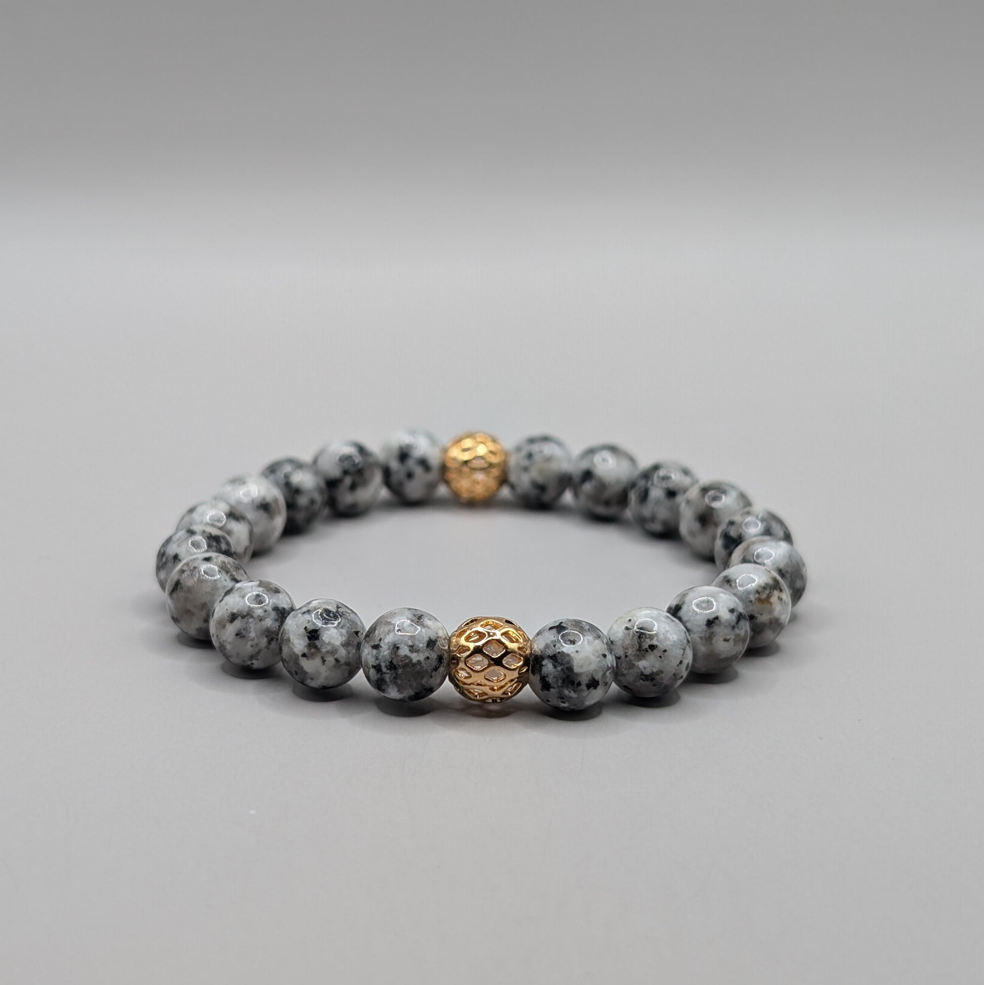 Our Dalmatian Jasper 8mm polished beads feature a unique combination of grey, white, and black spots, accented by two gold beads.